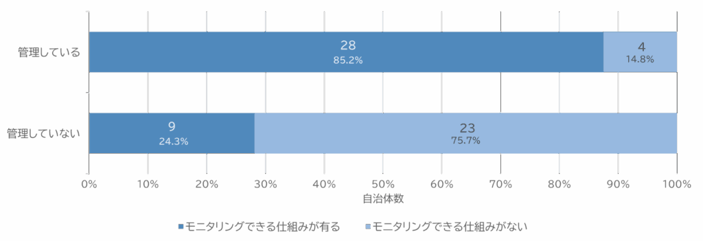 データ連携基盤の運用状況を把握するための「モニタリングできる仕組み」については、28自治体(約45%)が「仕組みがあり、管理している」と回答し、適切な統制が行われています。一方で、モニタリングの仕組みがなく管理を行っていない自治体も23自治体(約37%)存在しており、安定運用の観点から今後仕組みの導入が求められます。