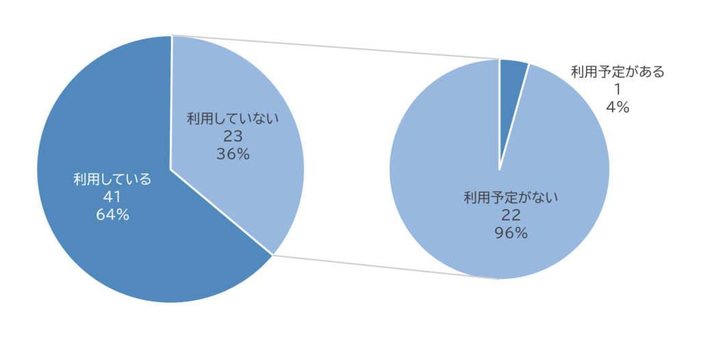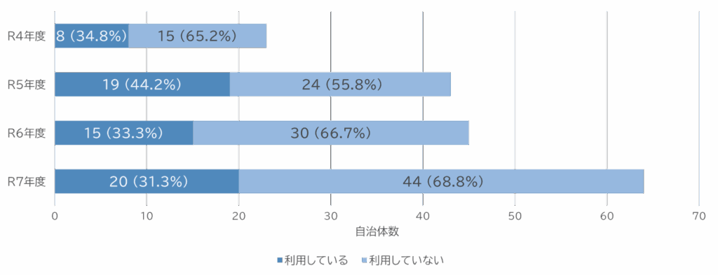 《対象自治体》 アンケート回答のあった62自治体(地方公共団体コード順), 北海道札幌市、北海道小清水町、北海道上士幌町、北海道更別村、青森県むつ市、宮城県仙台市、福島県、茨城県つくば市、栃木県矢板市、栃木県那須塩原市、群馬県前橋市、群馬県嬬恋村、埼玉県秩父市、千葉県市原市、東京都千代田区、東京都渋谷区、東京都江戸川区、東京都狛江市、神奈川県、富山県、富山県朝日町、福井県、山梨県、長野県、長野県茅野市、岐阜県、静岡県浜松市、静岡県三島市、静岡県焼津市、愛知県岡崎市、京都府、兵庫県姫路市、兵庫県加古川市、兵庫県加西市、兵庫県養父市、和歌山県有田市、和歌山県白浜町、和歌山県すさみ町、鳥取県、岡山県津山市、岡山県真庭市、岡山県西粟倉村、岡山県吉備中央町、広島県、広島県呉市、山口県山口市、山口県山陽小野田市、香川県高松市、香川県東かがわ市、香川県三豊市、愛媛県、愛媛県新居浜市、愛媛県西条市、福岡県、福岡県福岡市、佐賀県佐賀市、長崎県、熊本県、大分県臼杵市、宮崎県都城市、宮崎県都農町、宮崎県延岡市