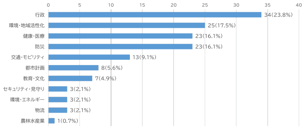 データ連携基盤に接続されているサービスの分野としては、「行政」が最も多く(約24%)、次いで「環境・地域活性化」「健康・医療」「防災」の順となりました。これら上位4分野で全体の約7割を占めており、住民サービスに直結する領域や、地域の課題解決に向けた分野でのデータ連携ニーズが高いことがわかります。